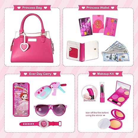Shemira Play Purse for Little Girls, Princess Pretend Toys for Girls 3 4 5 6 7 8 Years Old, Christmas & Birthday Gift for Kids Age 3-5 4-6 6-8, Toddler Purse with Accessories, Kids Toy Purse, Pink