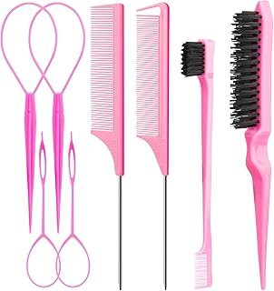 Aigee 8Pcs Hair Styling Combs Set Include 4Pcs Topsy Hair Tail Tools 2 Styles of Rat Tail Comb,1Pcs Bristle Teasing Slick Back hair Brush,1Pcs Edge Control Brush,Eyebrow Brush for Woman Girl Pink